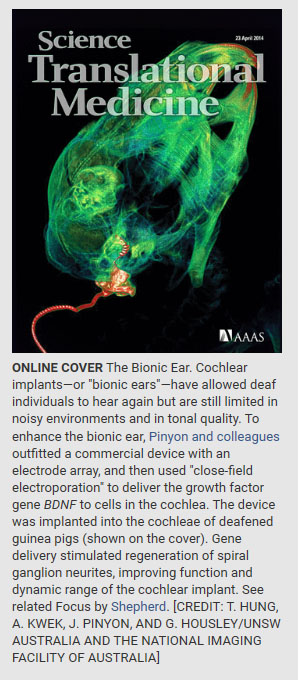 * Close-Field Electroporation Gene Delivery Using the Cochlear Implant Electrode Array Enhances the Bionic Ear Jeremy L. Pinyon, Sherif F. Tadros, Kristina E. Froud, Ann C. Y. Wong, Isabella T. Tompson, Edward N. Crawford, Myungseo Ko, Renée Morris, Matthias Klugmann, Gary D. Housley Science Translational Medicine23 Apr 2014 : 233ra54 Neurotrophin gene delivery, achieved by “close-field” electroporation (gene electrotransfer) of mesenchymal cells adjacent to the cochlear implant, improved hearing in deafened guinea pigs. Commentary: Robert K. Shepherd, Andrew K. Wise Science Translational Medicine23 Apr 2014 : 233fs17 Close-field electroporation gene delivery using the cochlear implant electrode array enhances the bionic ear (Pinyon et al., this issue). The Naked Scientists - "Improving the cochlear implant"- an interview with Gary Housley, University of New South Wales 28th April, 2014. Click here to download the audio file |